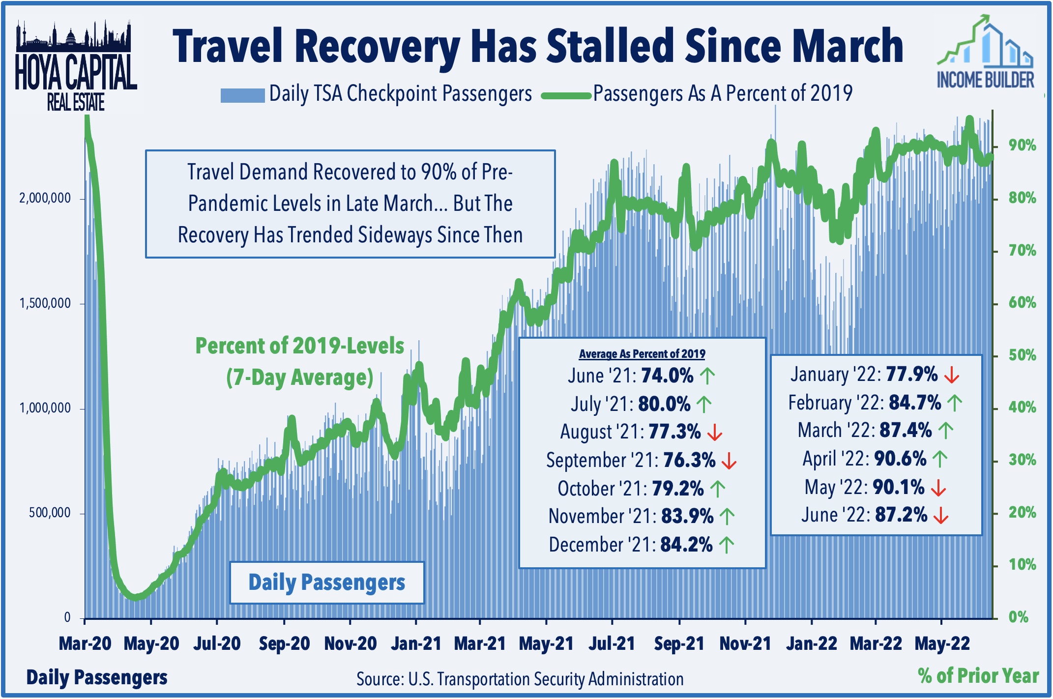 Hotel: Pebblebrook (PEB) was a laggard today after providing a business update in which it noted that its operating metrics softened a bit in May compared to April, but attributed the weakening to seasonal patterns rather than recent economic concerns. Its Revenue Per Available Room ("RevPAR") was 9% below comparable pre-pandemic levels in May, giving back some ground from April when its REVPar was within 5% of pre-pandemic levels. Recent TSA Checkpoint data has shown some signs of softening demand as well with June on pace to record the softest demand relative to pre-pandemic levels since the end of the Omicron outbreak back in early March.