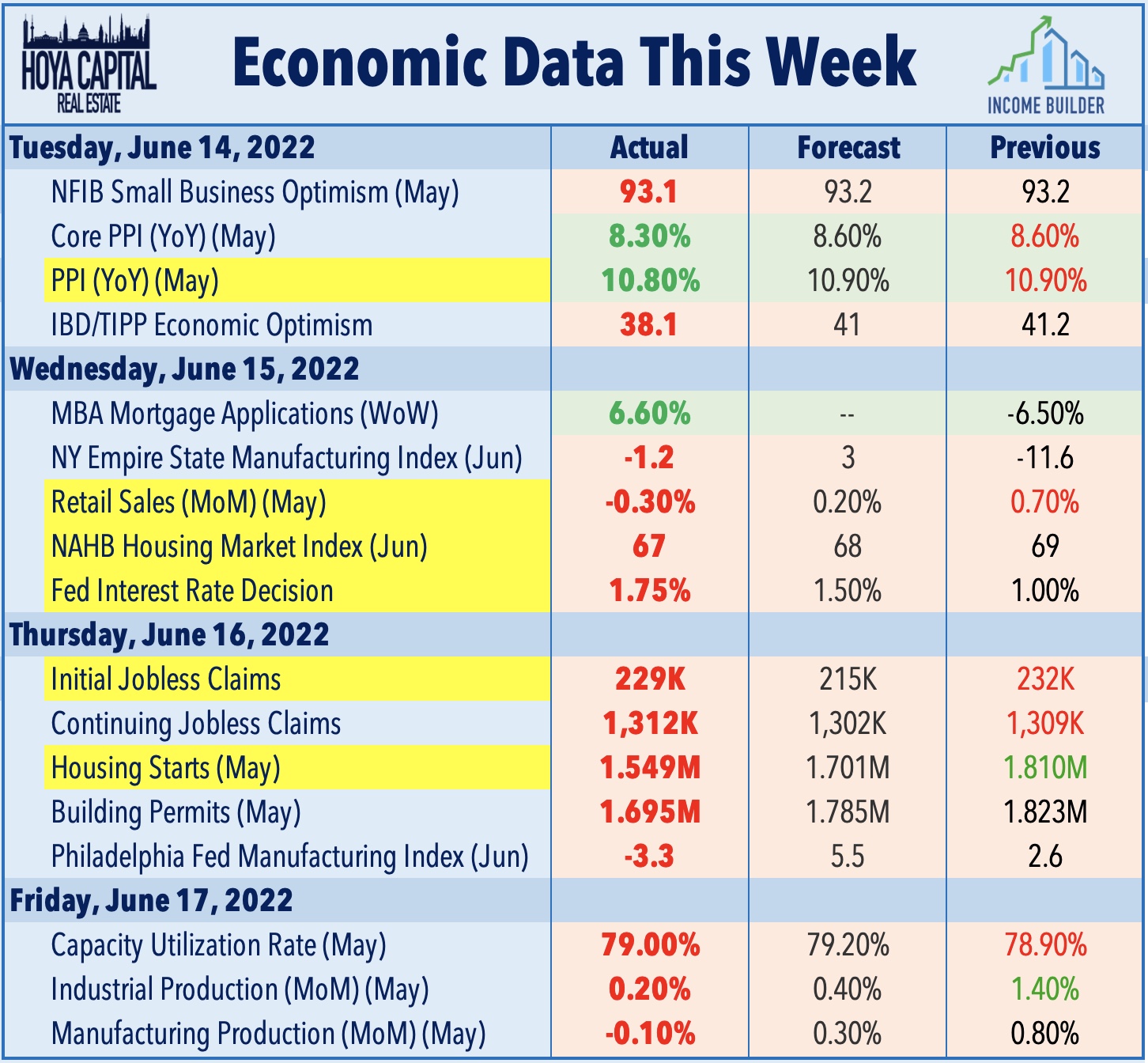U.S. equity markets stabilized Friday on an otherwise brutal week as mounting concerns over an economic "hard landing" has sent the major benchmarks to the lowest levels since late 2020. Posting weekly declines of more than 6% - its tenth decline in the past eleven weeks, the S&P 500 finished higher by 0.3% today but remains more than 23% below its recent highs. The Mid-Cap 400 and Small-Cap 600 each advanced about 1% today, but posted notable declines of nearly 8% on the week. Real estate equities rebounded as well today as the Equity REIT Index advanced 0.8% today - ending the week with declines of 5.3% - while the Mortgage REIT Index rebounded 4% but still finished the week with declines of over 13%.