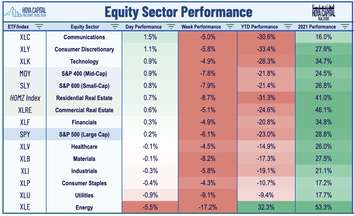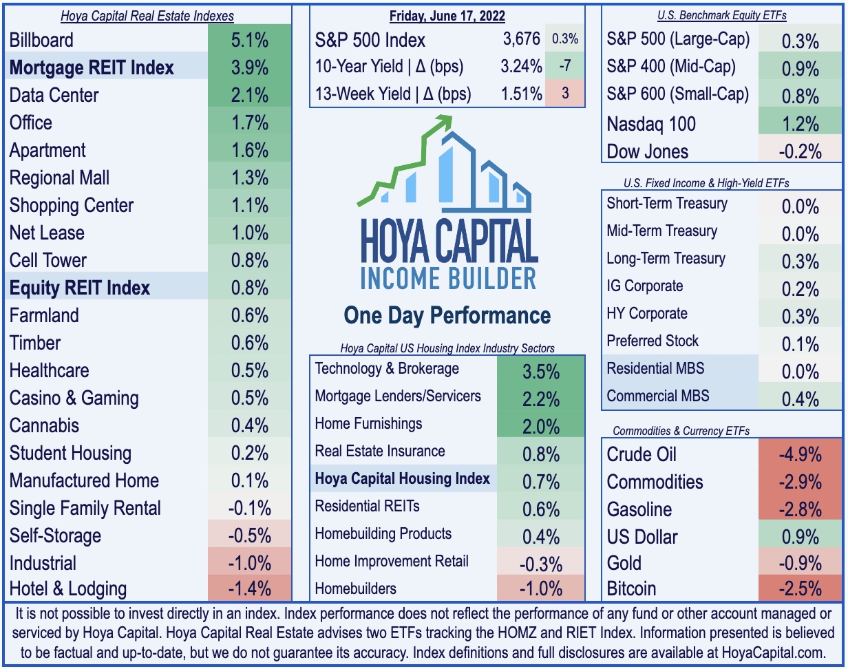 Disclosure: Hoya Capital Real Estate advises two Exchange-Traded Funds listed on the NYSE. In addition to any long positions listed below, Hoya Capital is long all components in the Hoya Capital Housing 100 Index and in the Hoya Capital High Dividend Yield Index. Index definitions and a complete list of holdings are available on our website.