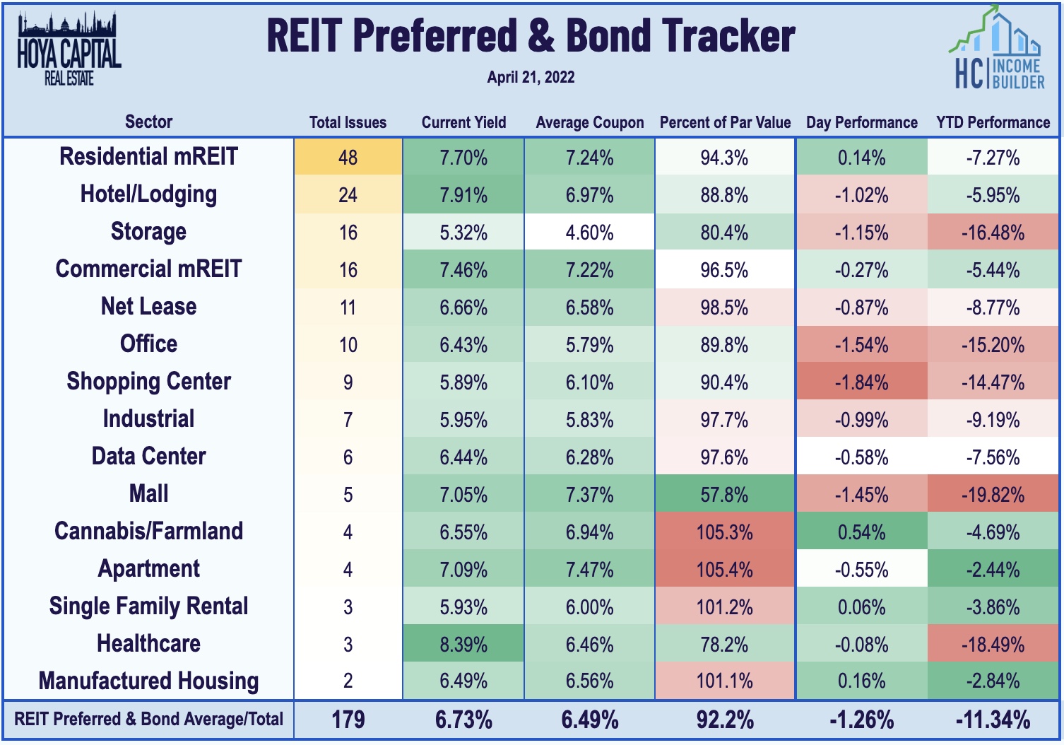 Per the Income Builder Preferred Tracker available to Income Builder subscribers, the Hoya Capital REIT Preferred Index finished lower by 1.26% today. REIT Preferreds ended 2021 with price returns of roughly 8.0% and total returns of roughly 14%. There are now 186 REIT-issued exchange-listed preferred and debt securities with an average current yield of 6.73%. Over in the capital market today, VICI Properties (VICI) priced $5B of senior unsecured notes in five tranches: $500M of 4.375% notes due May 15, 2025; $1.25B of 4.750% notes due February 15, 2028; $1B of 4.950% notes due February 15, 2030; $1.5B of 5.125% notes due May 15, 2032; and $750M of 5.625% notes due May 15, 2052.
