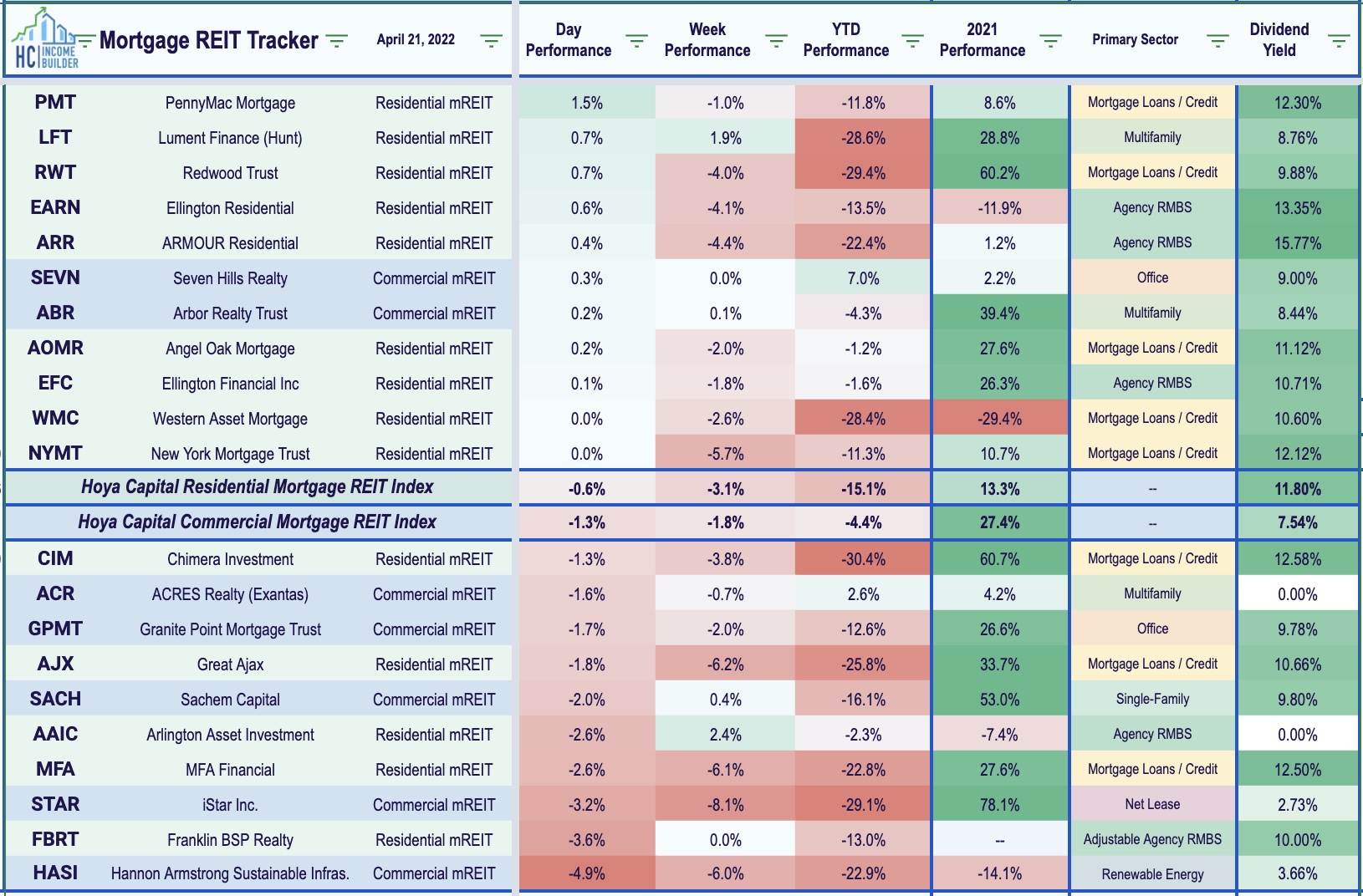 Per the REIT Rankings Tracker available to Income Builder subscribers, mREITs were mostly-lower today as commercial mREITs slipped 1.3% while residential mREITs declined 0.6%. Mortgage REIT earnings season officially kicks off next Monday with results from KKR Real Estate (KREF) and Apollo Commercial (ARI).