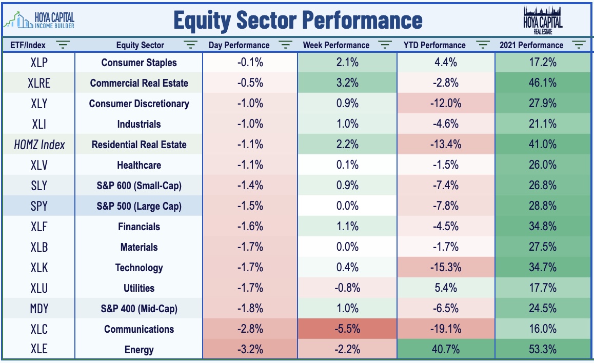 Disclosure: Hoya Capital Real Estate advises two Exchange-Traded Funds listed on the NYSE. In addition to any long positions listed below, Hoya Capital is long all components in the Hoya Capital Housing 100 Index and in the Hoya Capital High Dividend Yield Index. Index definitions and a complete list of holdings are available on our website.