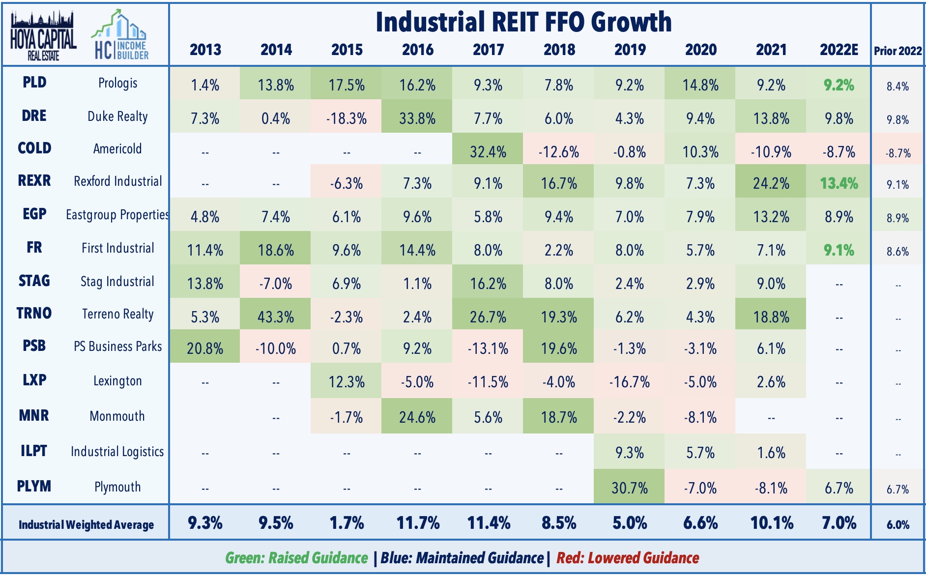 Industrial: First Industrial (FR) finished lower by about 2% after reporting in-line results yesterday afternoon. FR modestly raised the midpoint of its full-year FFO and NOI, as well as its occupancy guidance. FR now sees full-year FFO growth of 9.1% - up 50 basis points from its prior outlook - and sees same-store NOI growth of 8.3% - up also higher by 50 bps. Earlier in the week, Prologis (PLD) and Rexford (REXR) also raised their guidance across the board on incredible rent growth with PLD seeing rent growth on renewals of 42% and REXR recording releasing spreads of 71% as demand for logistics space remains insatiable amid ongoing supply chain disruptions.