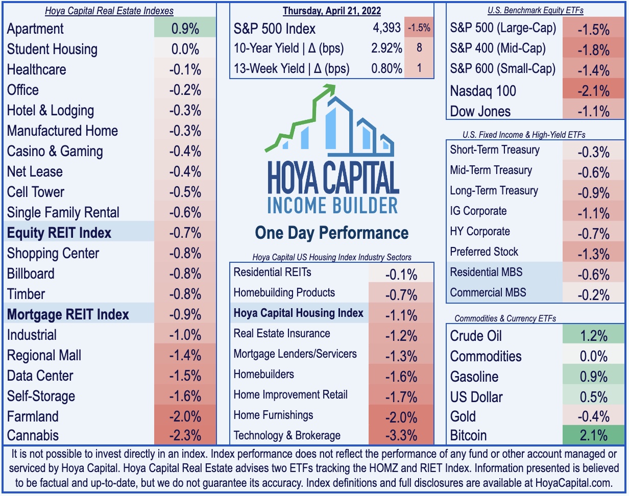 U.S. equity markets finished broadly lower Thursday - sliding from early-session gains - while bonds remained under-pressure after Fed Chair Powell indicated that the Fed is likely to hike rates by 50 basis points in its next meeting. Sliding throughout the session and giving up its week-to-date gains, the S&P 500 finished lower by 1.5% today while the Mid-Cap 400 declined 1.8% and the Small-Cap 600 slipped 1.4%. Real estate equities were again among the outperformers on strong earnings result, but still finished lower as the Equity REIT Index slipped 0.7% with 18-of-19 property sectors in negative territory while Mortgage REITs declined by 0.9%.